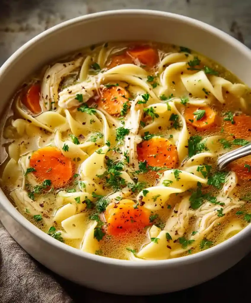 Nothing feels quite as soothing as a bowl of classic chicken noodle soup, gently simmered with tender chicken, soft egg noodles, and fragrant vegetables. This recipe brings cozy comfort to your kitchen in under an hour, making it perfect for chilly evenings, busy weeknights, or those moments when you simply need something warm and nourishing. The broth becomes rich and flavorful with every simmered minute, while the carrots, celery, and herbs bring just the right touch of homestyle freshness. Whether you’re serving the family or craving a comforting bowl just for yourself, this simple and satisfying soup delivers heartwarming goodness in every spoonful. 🍲🌿