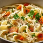 Nothing feels quite as soothing as a bowl of classic chicken noodle soup, gently simmered with tender chicken, soft egg noodles, and fragrant vegetables. This recipe brings cozy comfort to your kitchen in under an hour, making it perfect for chilly evenings, busy weeknights, or those moments when you simply need something warm and nourishing. The broth becomes rich and flavorful with every simmered minute, while the carrots, celery, and herbs bring just the right touch of homestyle freshness. Whether you’re serving the family or craving a comforting bowl just for yourself, this simple and satisfying soup delivers heartwarming goodness in every spoonful. 🍲🌿
