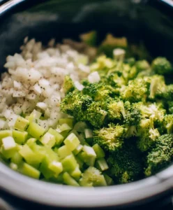 Chop the broccoli, celery, and onion into small pieces. Add them to the slow cooker along with butter, garlic, salt, and pepper. The aroma will start building right away. 🥦✨