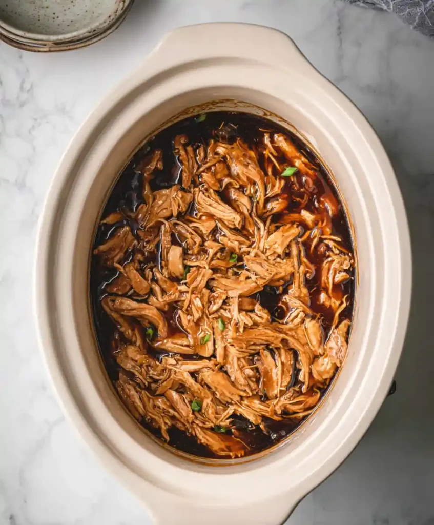 Return the shredded chicken to the slow cooker. Stir it into the teriyaki sauce until coated and glossy. Cook for 5–10 minutes to warm through.