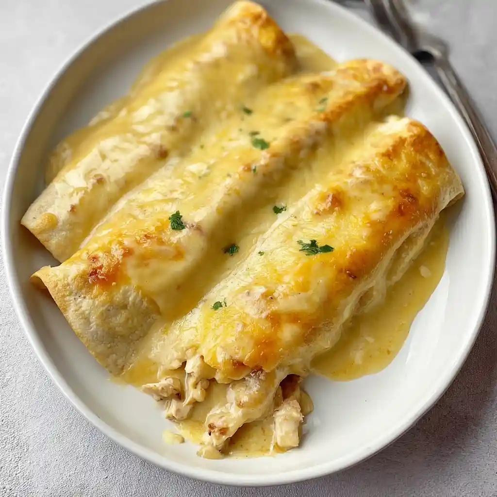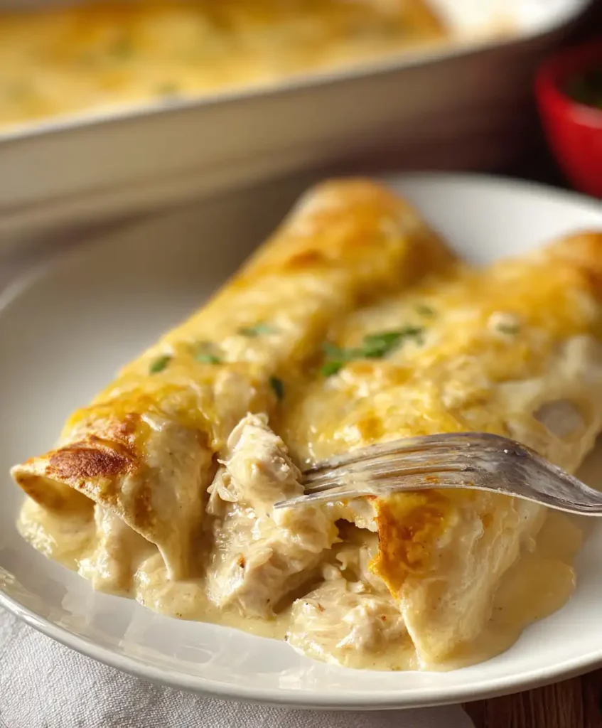 Creamy white chicken enchiladas filled with tender chicken, cheese, and a silky homemade sauce.