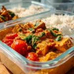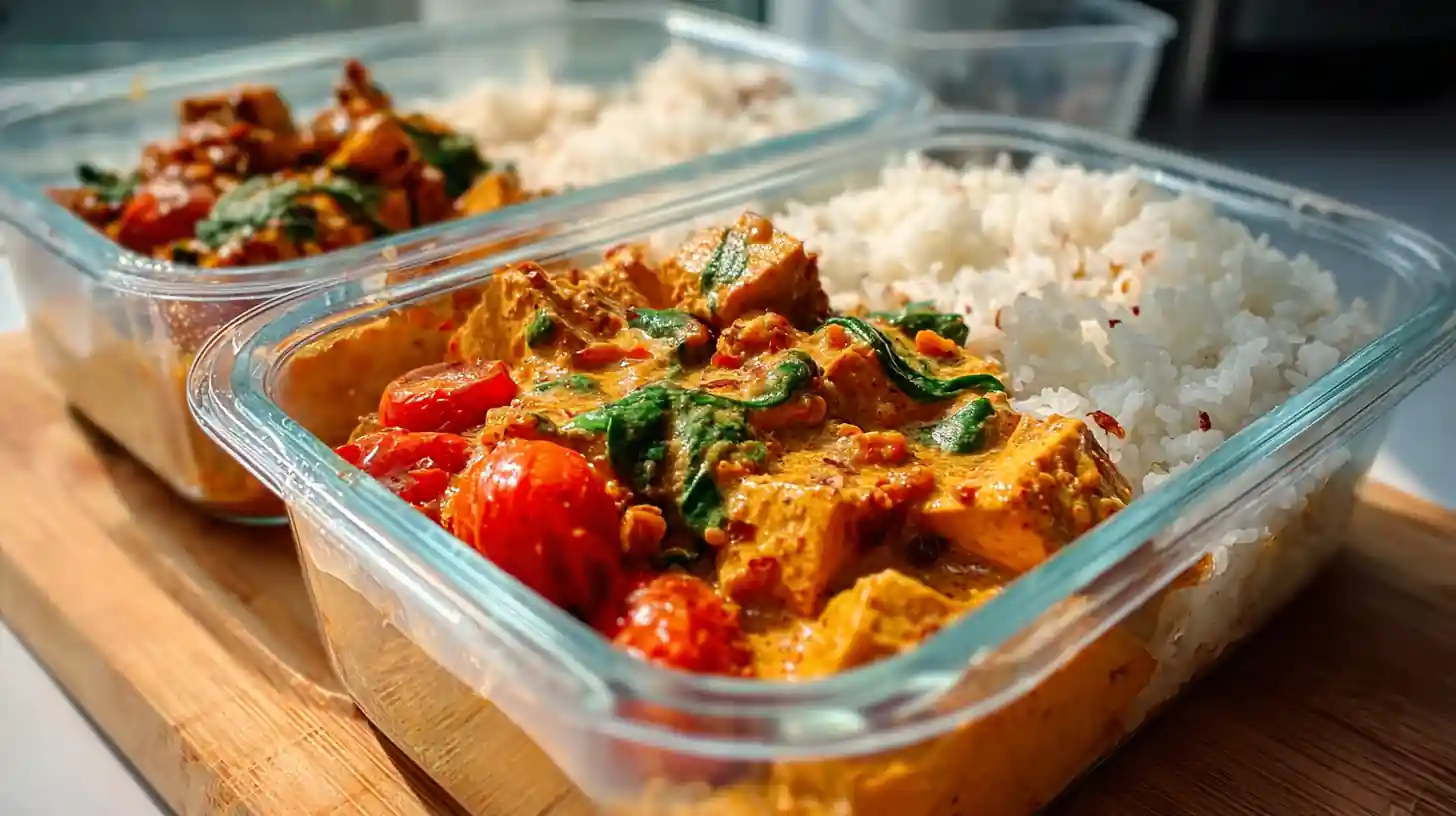 This creamy Tuscan tofu is a high-protein vegan meal prep dream — crispy tofu bites coated in cornstarch, pan-seared until golden, then simmered in a rich tomato and spinach sauce. It’s hearty, nourishing, and packed with flavor, making it the perfect go-to for weekly lunches or dinners. Paired with fluffy rice, each box delivers a satisfying, balanced meal that reheats beautifully and keeps you full for hours. Simple ingredients, bold flavors, and ready in just 40 minutes — exactly what busy weeks need.