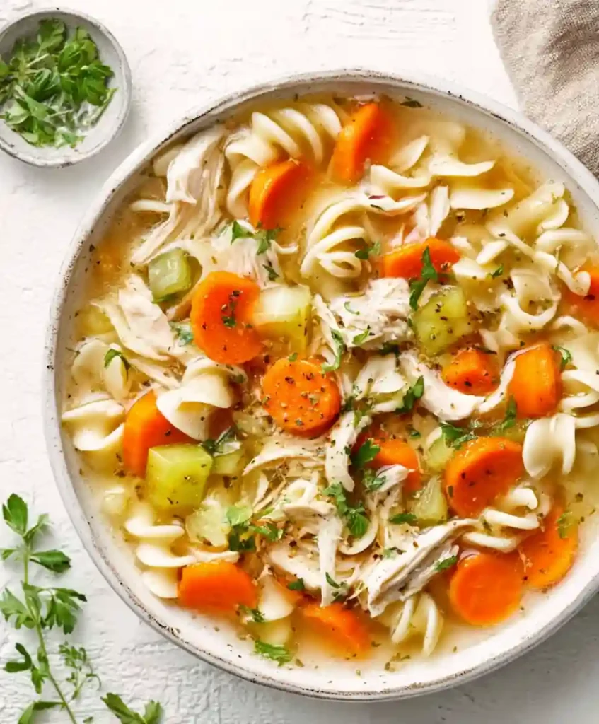 This Panera Chicken Noodle Soup copycat recipe brings all the comforting, fresh flavors you love straight to your kitchen in just 30 minutes. The broth simmers with tender rotisserie chicken, vibrant carrots, celery, and curly egg noodles for a warm and soothing bowl that tastes just like the café version — maybe even better. The vegetables stay bright and soft, the broth feels light yet nourishing, and the noodles add that perfect cozy texture. Whether you want a simple weeknight meal or something warm on a chilly day, this quick one-pot soup delivers comfort, flavor, and homemade ease every single time. 🍲✨