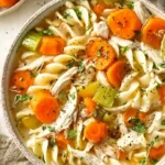 This Panera Chicken Noodle Soup copycat recipe brings all the comforting, fresh flavors you love straight to your kitchen in just 30 minutes. The broth simmers with tender rotisserie chicken, vibrant carrots, celery, and curly egg noodles for a warm and soothing bowl that tastes just like the café version — maybe even better. The vegetables stay bright and soft, the broth feels light yet nourishing, and the noodles add that perfect cozy texture. Whether you want a simple weeknight meal or something warm on a chilly day, this quick one-pot soup delivers comfort, flavor, and homemade ease every single time. 🍲✨